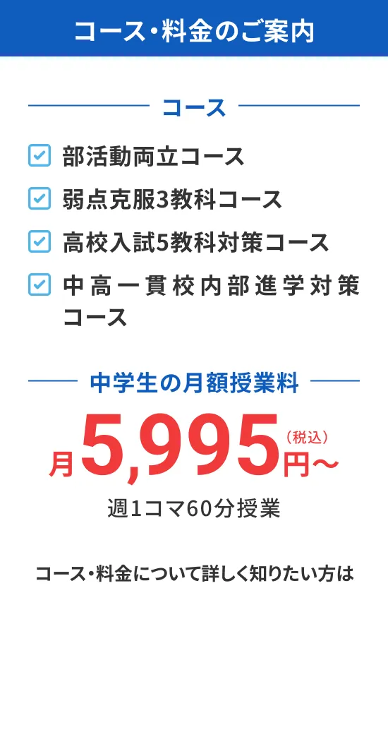 - 教科書準拠の教材を使用し、反復演習を軸に確実な教科書理解を進めます。一方的に教えるのではなく、段階的に質問を重ね、生徒から答えを引き出す指導で、考える力を育成し、応用力を鍛えていきます。