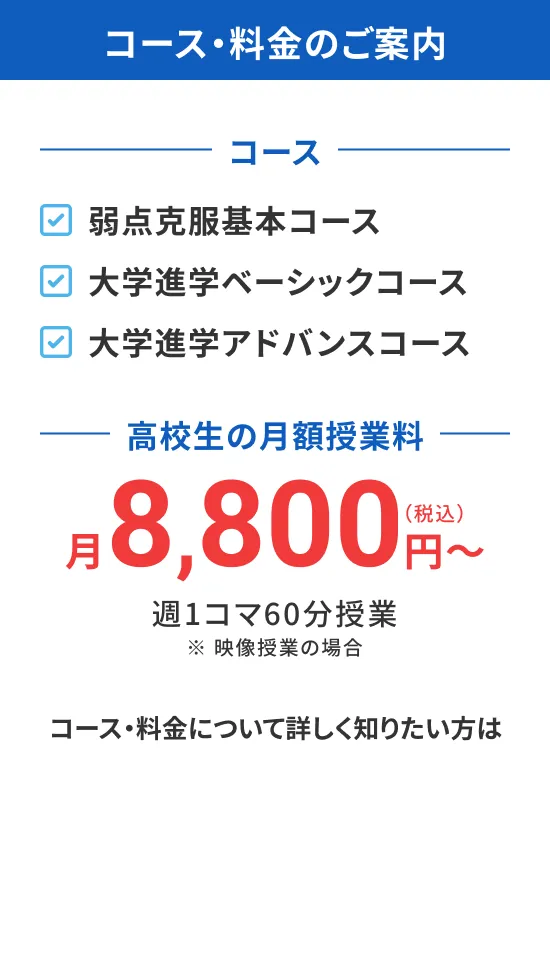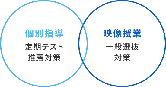 評定対策や総合型選抜、学校推薦型選抜の対策は個別指導を中心に、共通テストや一般選抜対策は映像授業(市進予備校「ウイングネット」)を中心に行います。さらに両方を組み合わせて、より効果的に学力を伸ばすことができます。